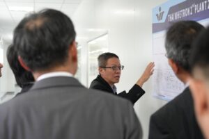 江世豐總經理向藍夏禮大使說明泰國輝創電子之產線與產品。