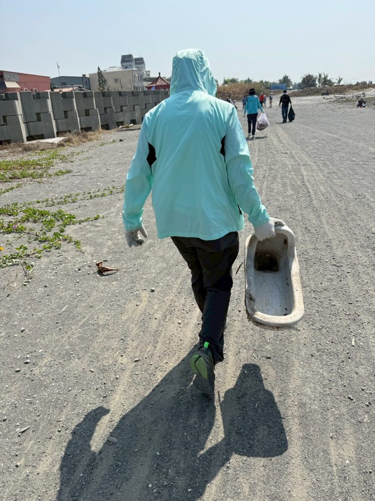 原本以為只會清理到吸管、尼龍繩等輕型塑膠的同仁們,看著眼前龐大且荒謬的大型海廢,像是那一蹲一坐的陶瓷馬桶座,突兀地半掩在海沙中,才意識到原來淨灘活動是如此重要。